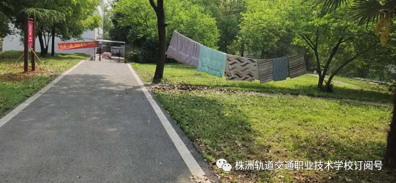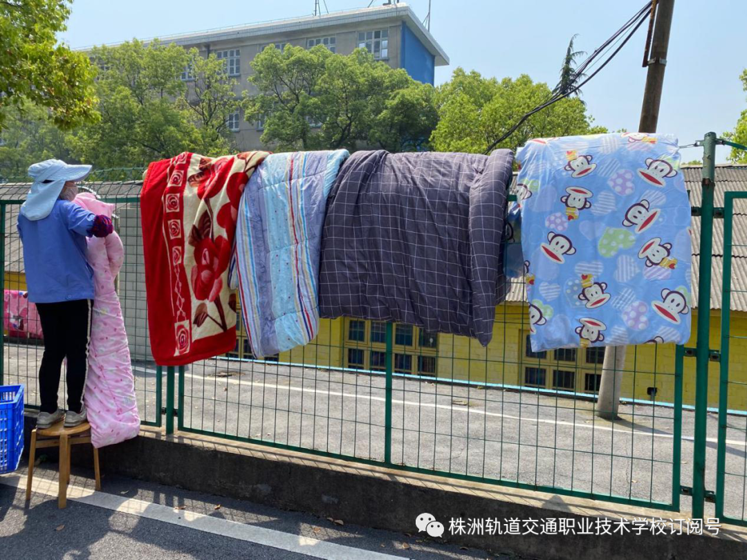 在湖南中職株軌學(xué)生返校之際,后勤阿姨們?cè)谶@與花共舞的日子里,無暇領(lǐng)略四月的美景,扎扎實(shí)實(shí)的在學(xué)生宿舍搞衛(wèi)生,幫忙曬床上用品。
