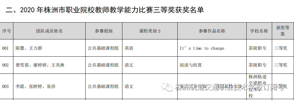 我校語文組李晨、張婷婷、易莎團隊,英語組曹玉嬌、王玨團隊,音樂組盧杏、徐崢嶸、鐘志祥團隊在株洲市職業(yè)院校教師教學(xué)能力比賽中榮獲三等獎,音樂組作品被推薦參加省賽,作品已經(jīng)提交省級網(wǎng)絡(luò)評審。本次競賽以賽促教,進一步提高了我校教師教學(xué)技能和課堂教學(xué)質(zhì)量,極大程度上促進了教師們的專業(yè)成長。