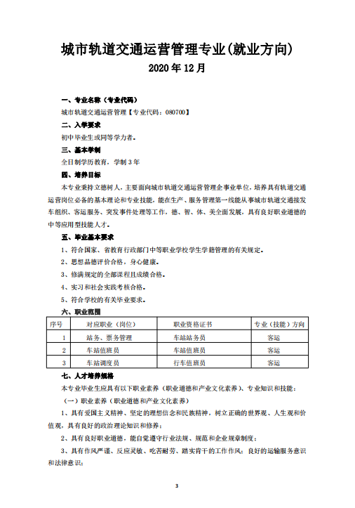 城市軌道交通運營管理專業(yè) (就業(yè)方向)人才培養(yǎng)方案 發(fā)布時間:2021-10-21 10:41:52 瀏覽量:4954 發(fā)布者:株洲軌道交通職業(yè)技術(shù)學(xué)校