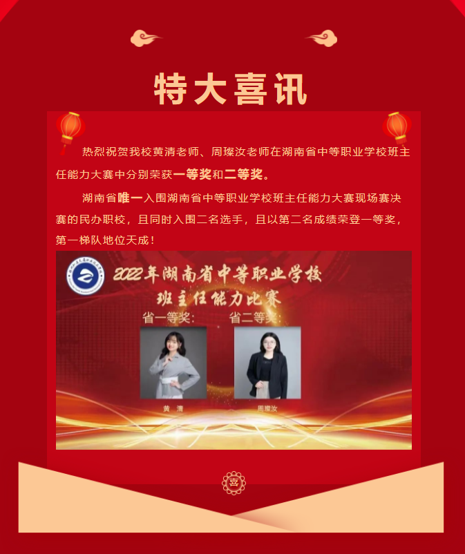 熱烈祝賀我校黃清老師、周璨汝老師在湖南省中等職業(yè)學(xué)校班主任能力大賽中分別榮獲一等獎(jiǎng)和二等獎(jiǎng) 發(fā)布時(shí)間:2022-09-14 11:53:15 瀏覽量:3432 發(fā)布者:株洲軌道交通職業(yè)技術(shù)學(xué)校